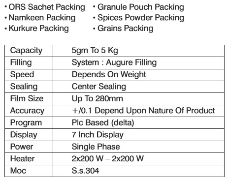 It uses a center sealing system and supports film sizes up to 280 mm. The filling accuracy is about ±0.1%, depending on the product nature.