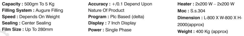This machine is designed to pack products ranging from 500 grams to 5 kilograms using an auger filling system, which is ideal for powders and similar products. The packing speed depends on the product weight.